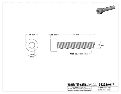 McMaster 91292A017 18-8 Stainless Steel Socket Head Screw M2.5 x 0.45 mm Thread, 14 mm Long 50PK