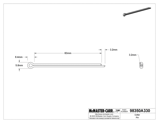 McMaster 98350A330 Cotter Pin Zinc-Plated Spring Steel, 3.2 mm Diameter, 63 mm Long PK25