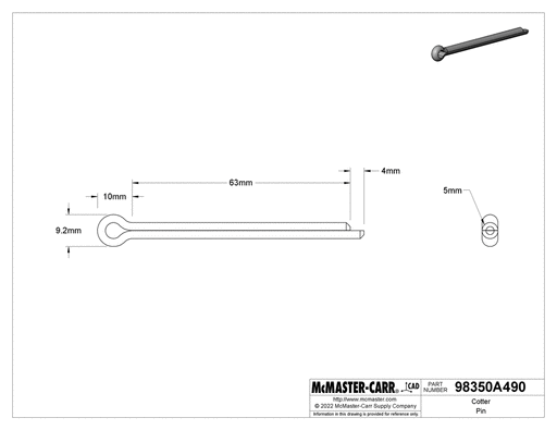 McMaster 98350A490 Cotter Pin Zinc-Plated Spring Steel, 5 mm Diameter, 63 mm Long