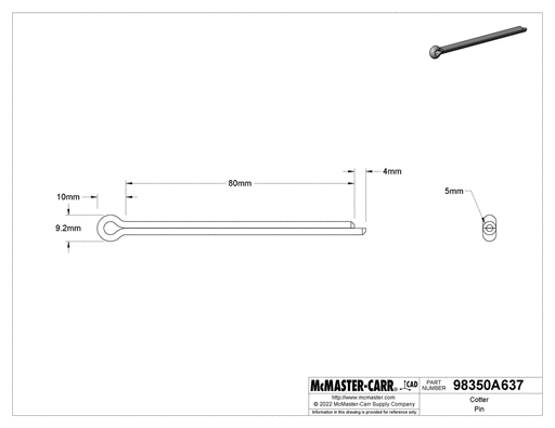 McMaster 98350A637 Cotter Pin Zinc-Plated Spring Steel, 5 mm Diameter, 80 mm Long