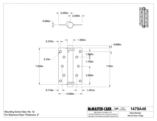 View full detailsMcMaster 1479A46 Mortise-Mount Door Hinge with Nonstd Holes, Square Corners, Black Steel, for 2" Door