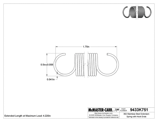 View full detailsMcMaster 9433K751 302 Stainless Steel Extension Spring with Hook Ends 1.75" Long, 0.5" OD, 0.041" Wire Diameter