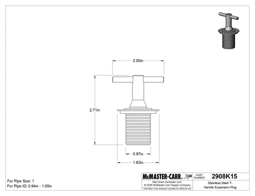 View full detailsMcMaster 2908K15 Stainless Steel T-Handle Expansion Plug for 1 Pipe Size
