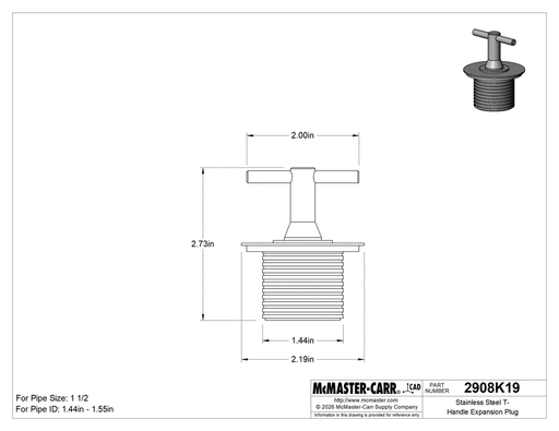 View full detailsMcMaster 2908K19 Stainless Steel T-Handle Expansion Plug for 1-1/2 Pipe Size