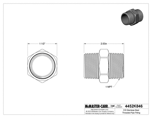 View full detailsMcMaster 4452K846 316 Stainless Steel Threaded Pipe Fitting Low-Pressure, Straight Connector, 1 NPT Male