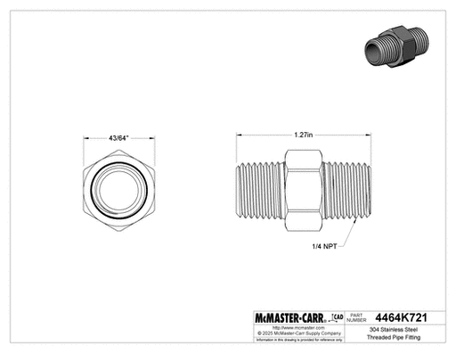 View full detailsMcMaster 4464K721 304 Stainless Steel Threaded Pipe Fitting Low Pressure, Straight Connector, 1/4 NPT Male