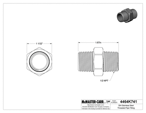 View full detailsMcMaster 4464K741 304 Stainless Steel Threaded Pipe Fitting Low Pressure, Straight Connector, 1/2 NPT Male