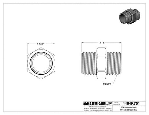 View full detailsMcMaster 4464K751 304 Stainless Steel Threaded Pipe Fitting Low Pressure, Straight Connector, 3/4 NPT Male