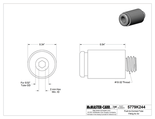 View full detailsMcMaster 5779K244 Push-to-Connect Tube Fitting for Air Adapter, for 5/32" Tube OD x 10-32 Thread Male Pipe