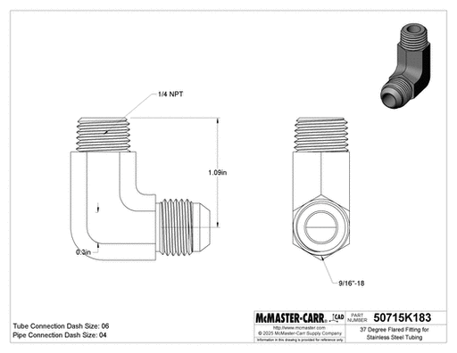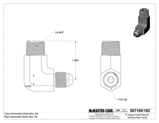 View full detailsMcMaster 50715K182 37 Degree Flared Fitting for Stainless Steel Tubing 90 Degree Adapter for 1/4" Tube OD x 1/4 NPT Male