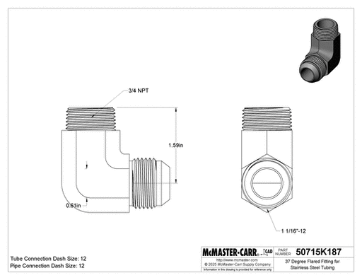 McMaster 50715K187 37 Degree Flared Fitting for Stainless Steel Tubing 90 Degree Adapter for 3/4" Tube OD x 3/4 NPT Male Shape 90° Elbow ...