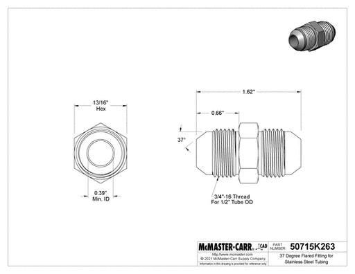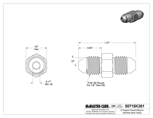 View full detailsMcMaster 50715K263 37 Degree Flared Fitting for Stainless Steel Tubing Straight Connector for 1/2" Tube OD