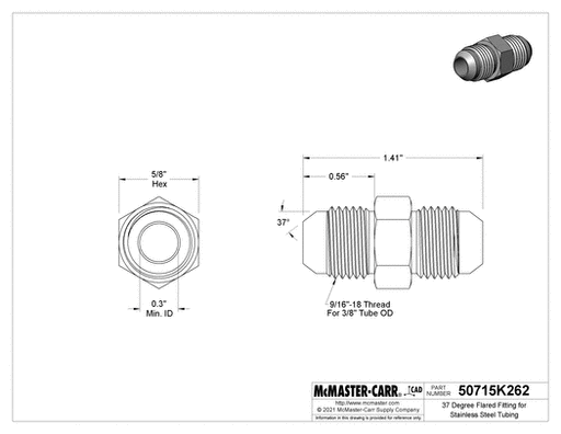 View full detailsMcMaster 50715K262 37 Degree Flared Fitting for Stainless Steel Tubing Straight Connector for 3/8" Tube OD