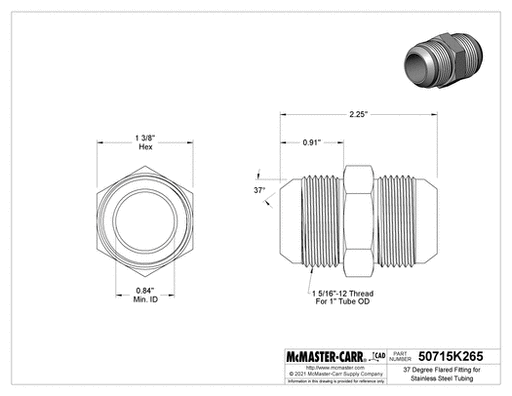 View full detailsMcMaster 50715K265 37 Degree Flared Fitting for Stainless Steel Tubing Straight Connector for 1" Tube OD