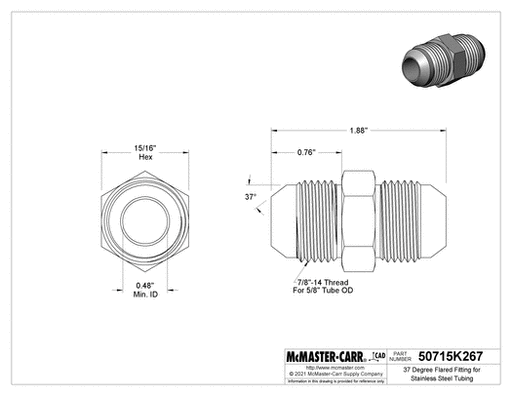 McMaster 50715K263 37 Degree Flared Fitting for Stainless Steel Tubing Straight Connector for 1/2" Tube OD Also known as JIC (Joint Industrial ...
