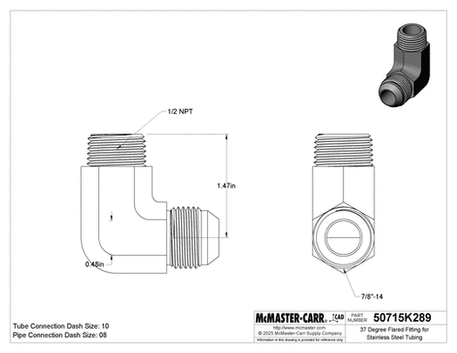 View full detailsMcMaster 50715K185 37 Degree Flared Fitting for Stainless Steel Tubing 90 Degree Adapter for 1/2" Tube OD x 3/8 NPT Male