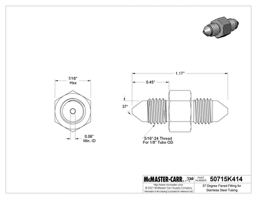 McMaster 50715K414 37 Degree Flared Fitting for Stainless Steel Tubing Straight Connector for 1/8" Tube OD Also known as JIC (Joint Industrial ...