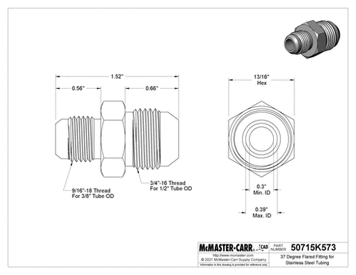 View full detailsMcMaster 50715K573 37 Degree Flared Fitting for Stainless Steel Tubing Straight Reducer for 1/2" Tube OD x 3/8" Tube OD