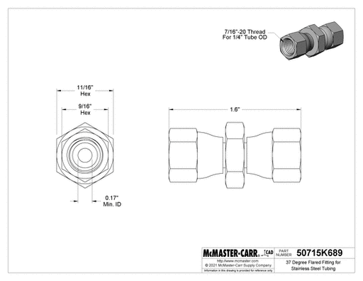 View full detailsMcMaster 50715K689 37 Degree Flared Fitting for Stainless Steel Tubing Straight Connector with Swivel, for 1/4" Tube OD