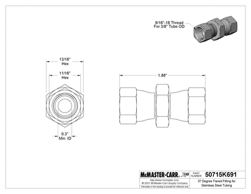View full detailsMcMaster 50715K691 37 Degree Flared Fitting for Stainless Steel Tubing Straight Connector with Swivel, for 3/8" Tube OD