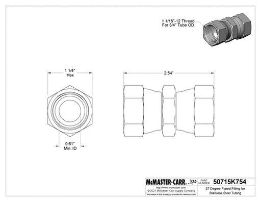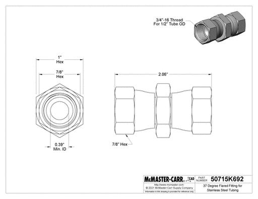 View full detailsMcMaster 50715K692 37 Degree Flared Fitting for Stainless Steel Tubing Straight Connector with Swivel, for 1/2" Tube OD