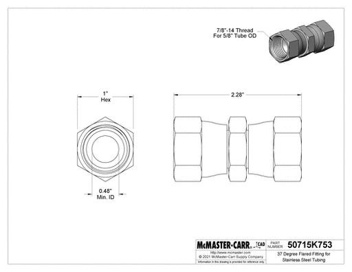 View full detailsMcMaster 50715K753 37 Degree Flared Fitting for Stainless Steel Tubing Straight Connector with Swivel, for 5/8" Tube OD