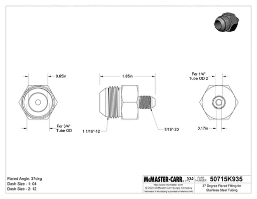 View full detailsMcMaster 50715K935 37 Degree Flared Fitting for Stainless Steel Tubing Straight Reducer for 3/4" Tube OD x 1/4" Tube OD