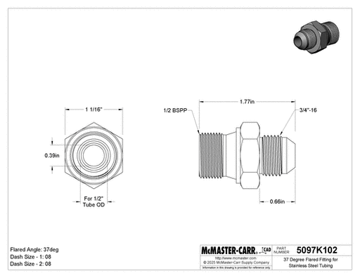 View full detailsMcMaster 5097K102 37 Degree Flared Fitting for Stainless Steel Tubing Straight Adapter for 1/2" Tube OD x 1/2 BSPP Male
