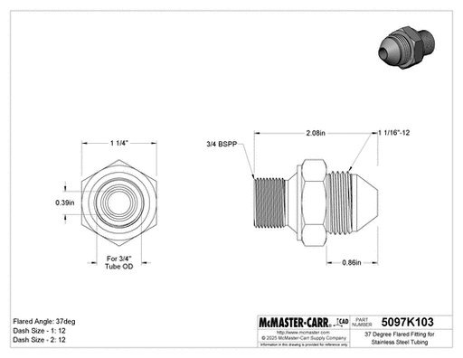 View full detailsMcMaster 5097K103 37 Degree Flared Fitting for Stainless Steel Tubing Straight Adapter for 3/4" Tube OD x 3/4 BSPP Male